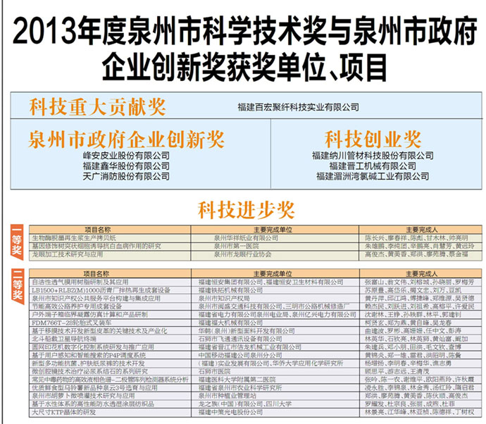 评选活动共收到符合申报要求的项目243个,经过项目申报、形式审查、公示及专家组评审等环节,及市科学技术奖评审委员会审核后,诞生评审结果:“福建百宏聚纤科技实业有限公司”获评泉州市科技重大贡献奖;“峰安皮业股份有限公司”等3家企业获评市政府企业创新奖;“福建纳川管材科技股份有限公司”等3家企业获评泉州市科技创业奖。此外,因今年申报泉州科技进步奖项目数量多、质量较高,科技进步奖和专利奖授奖数分别增至55项和27项。